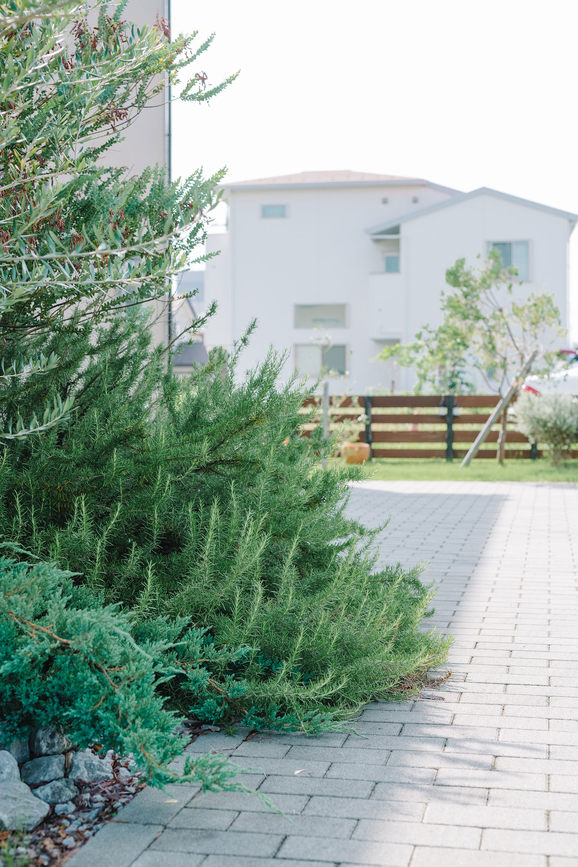壁を立てたり明確な境界は設けず、舗装の素材と植栽の色見、配置で曖昧な境い目を描く。