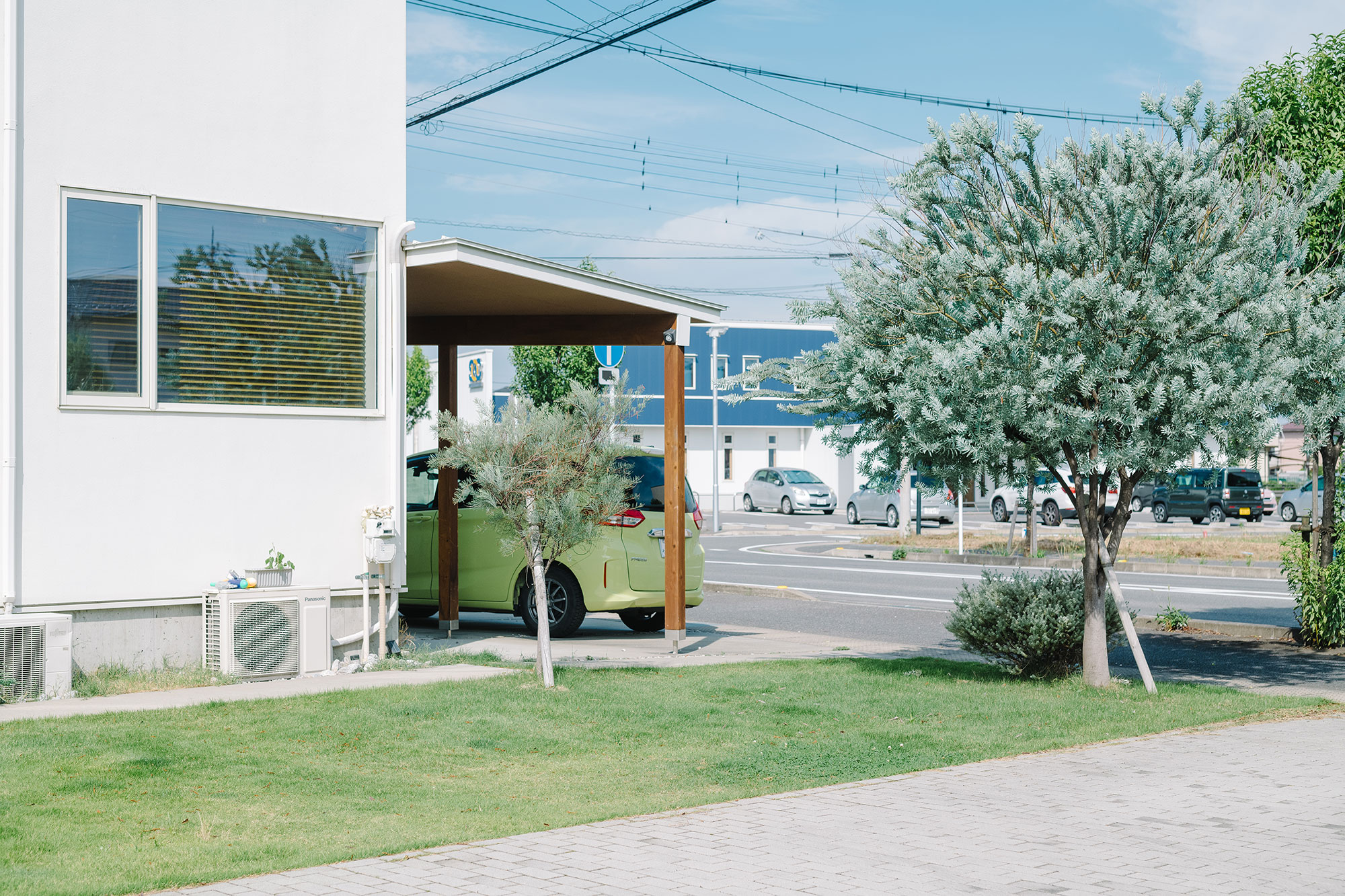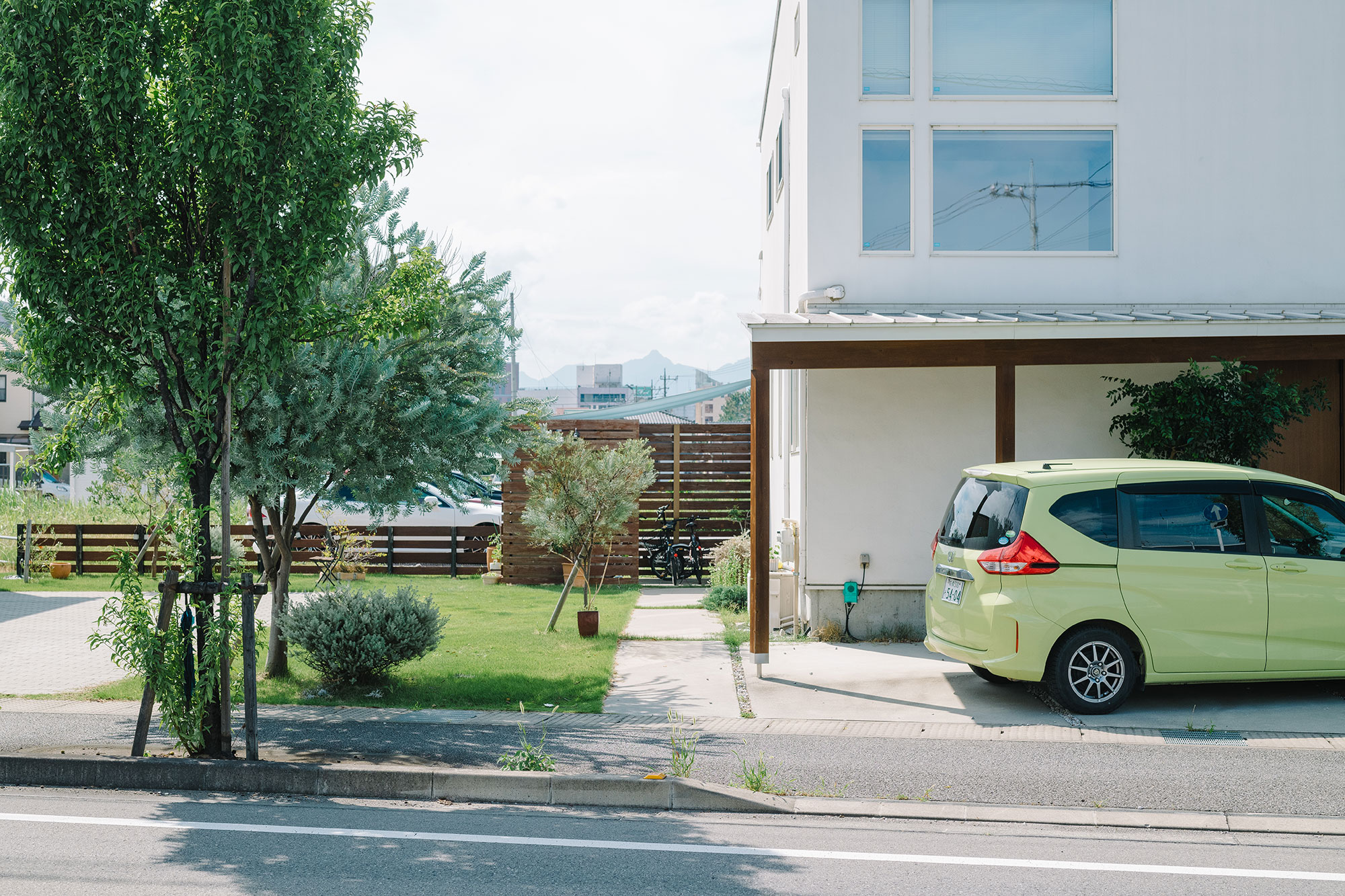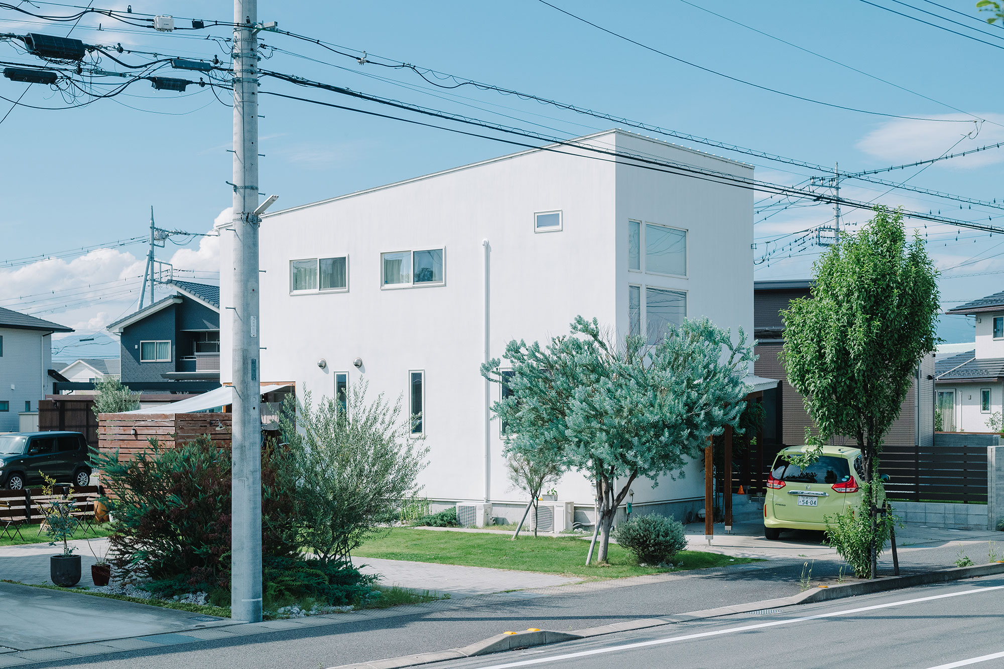 電柱の佇まい、広い歩道も庭の延長として取り込んでいて、