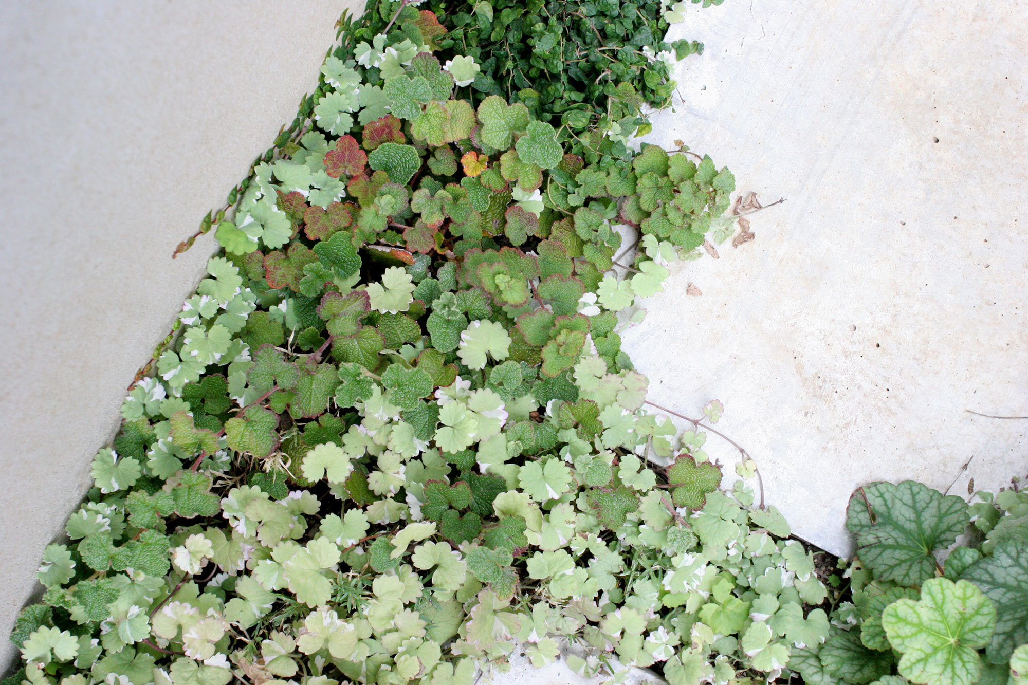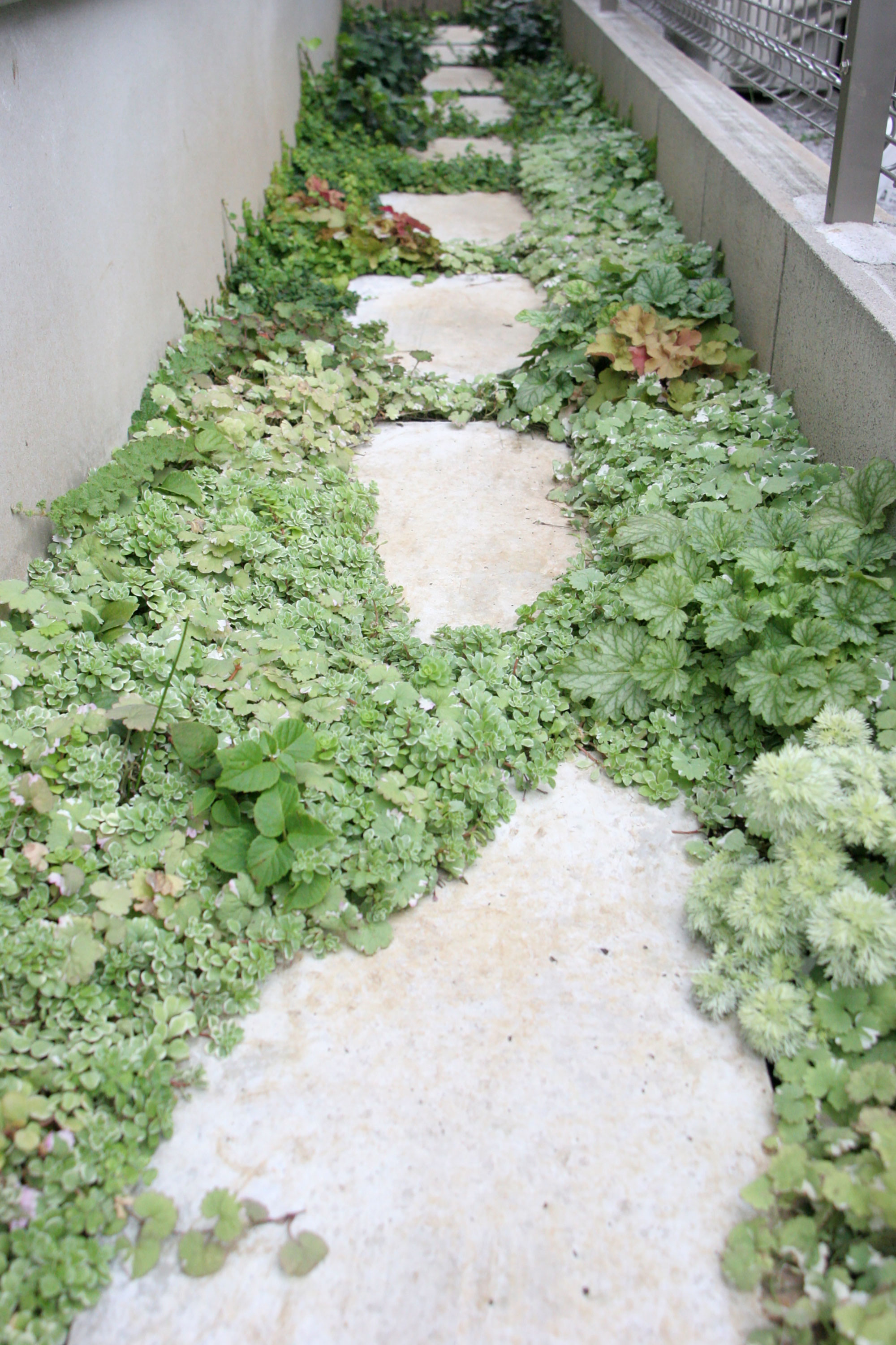 アプローチもシンプルなコンクリート平板と動きのあるセダムなどのグランドカバー。