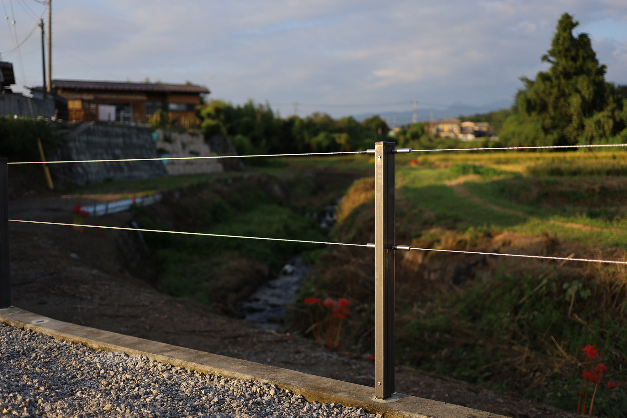 敷地を囲む用水路は、もともと明確な境界線として機能していたため、既存のメッシュフェンスは撤去。残された支柱にはコールテン鋼の角パイプを被せ、そこにステンレスロープを張って、視線を妨げないやわらかな境界をつくりました。