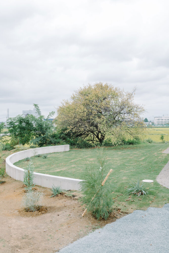 腰掛けほどの低い壁、小高い丘という立地、曖昧な境界が緩やかにつながる。