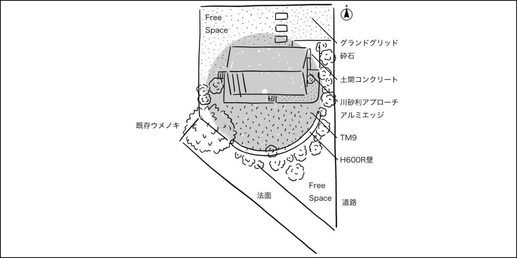 リビングを中心とする円の中に生活空間、小さな庭を作る計画です。
