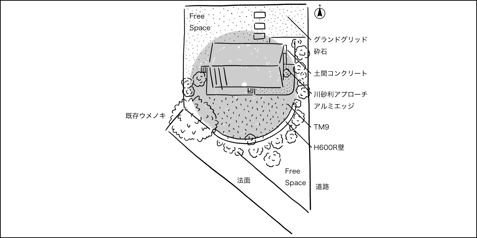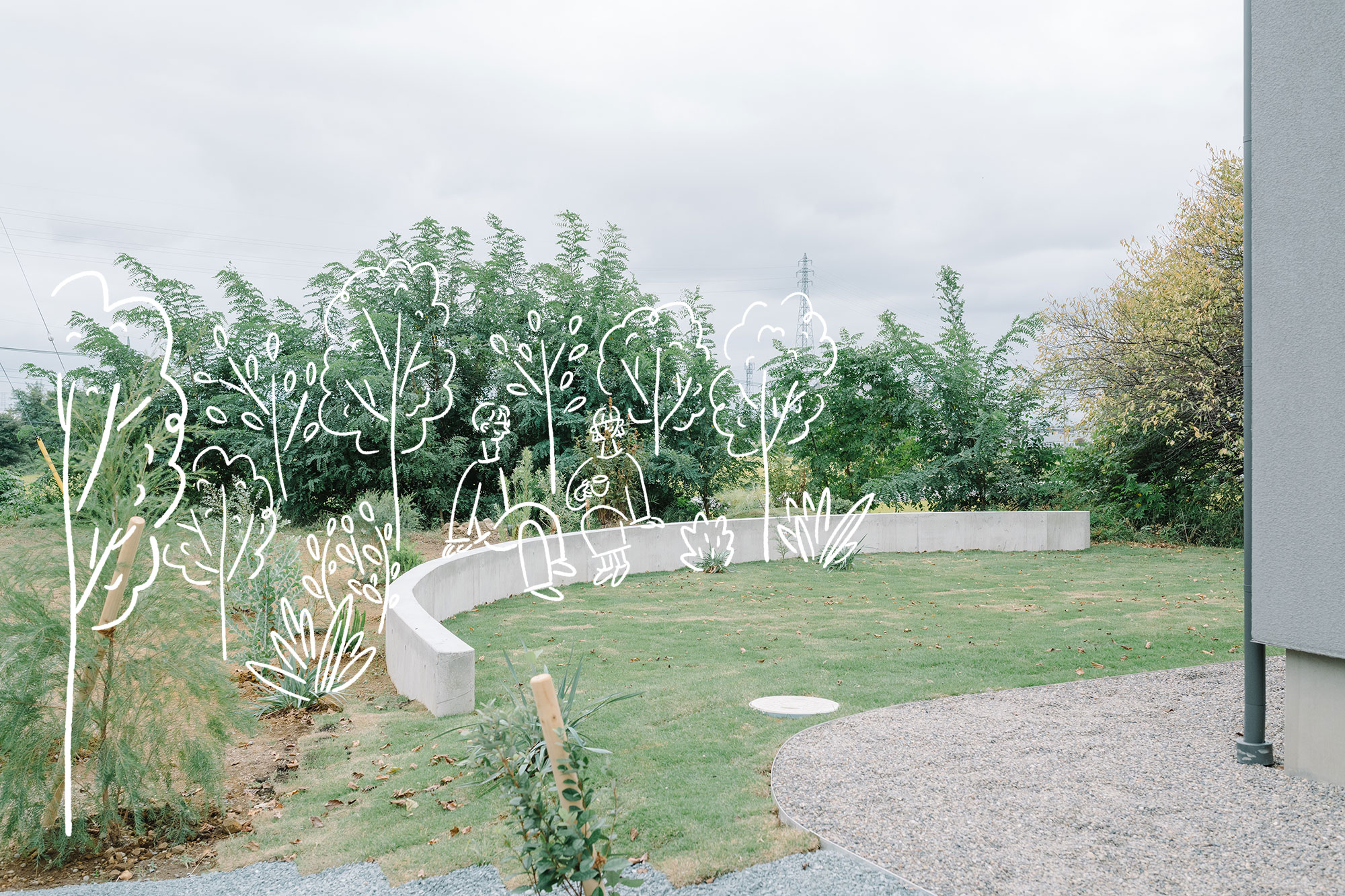 円弧の中には家に寄り添う住まいの庭、外を囲う木々のレイヤー、その先の風景と重なっていく。